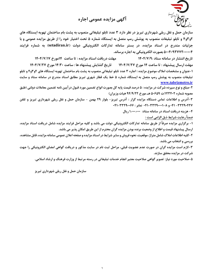 سازمان حمل و نقل ریلی شهرداری تبریز در نظر دارد 3 عدد تابلو تبلیغاتی منصوب به پشت بام ساختمان تهویه ایستگاه های 2و3و4 و تابلو تبلیغات منصوب به پوشش رمپ متصل به ایستگاه شماره 5 تحت اختیار خود را از طریق مزایده عمومی و با جزئیات مندرج در اسناد مزایده، در بستر سامانه تدارکات الکترونیکی دولت (setadiran.ir) را بصورت الکترونیکی به اجاره برساند.