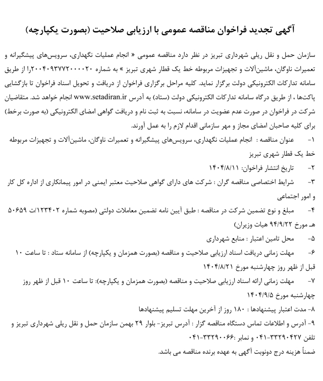 سازمان حمل و نقل ریلی شهرداری تبریز در نظر دارد مناقصه عمومی « انجام عملیات نگهداری، سرویسهای پیشگیرانه و تعمیرات ناوگان، ماشینآلات و تجهیزات مربوطه خط یک قطار شهری تبریز » را از طریق سامانه تدارکات الکترونیکی دولت برگزار نماید.