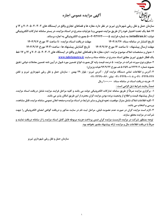 سازمان حمل و نقل ریلی شهرداری تبریز در نظر دارد مغازه ها و فضاهای تجاری واقع در ایستگاه های 2-3-4-5-6-7 و 12 و 17 خط یک تحت اختیار خود را از طریق مزایده عمومی و با جزئیات مندرج در اسناد مزایده، در بستر سامانه تدارکات الکترونیکی دولت (setadiran.ir) را بصورت الکترونیکی به اجاره برساند.
