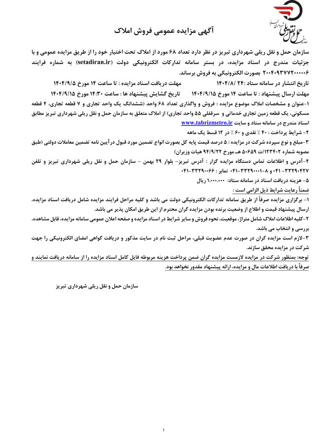 سازمان حمل و نقل ریلی شهرداری تبریز در نظر دارد تعداد 68 مورد از املاک تحت اختیار خود را از طریق مزایده عمومی و با جزئیات مندرج در اسناد مزایده، در بستر سامانه تدارکات الکترونیکی دولت (setadiran.ir) به شماره فرایند 2004093772000006 بصورت الکترونیکی به فروش برساند.