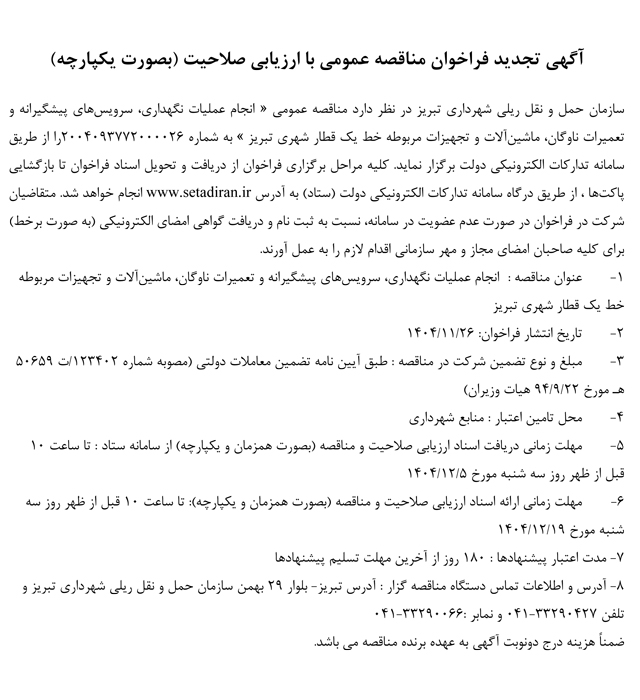 سازمان حمل و نقل ریلی شهرداری تبریز در نظر دارد مناقصه عمومی ‏« انجام عملیات نگهداری، سرویس‌های پیشگیرانه‌ و تعمیرات ناوگان، ماشین‌آلات و تجهیزات مربوطه خط یک قطار شهری تبریز »‏‏ را از طریق سامانه تدارکات الکترونیکی دولت برگزار نماید.